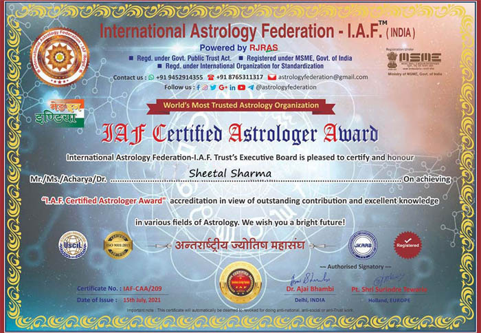 The well-known Astrologer Sheetal Sharma is distinguished mostly by her ability to use her understanding of astrology to assist others. she is a well-known astrologer throughout the world. because people seek her counsel and direction from all around the world. Her success in this sector can be attributed to the numerous awards she has received in recognition of her efforts and expertise. In many areas of life, such as relationships, business, job, and love, she consistently sets the best example.
